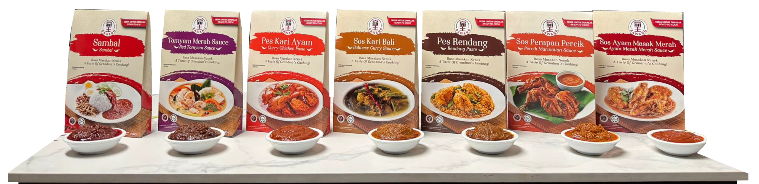 Introducing BAWANG—our range of ready-to-eat and ready-to-cook HALAL sauces and pastes, lovingly perfected over 15 years of culinary mastery. Each pack is the result of endless research, passionate experimentation, and a deep commitment to preserving the Taste of Truly Asia. From our signature Sambal, to rich Rendang and aromatic Ayam Masak Merah, every product is proudly crafted by Malaysians, and for anyone who cherishes real, honest and aromatic flavours.